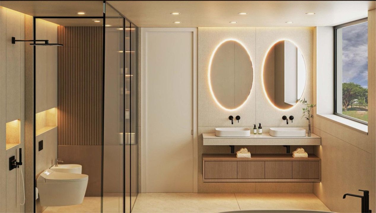 Boven biedt de master suite een ware toevluchtsoord van meer dan 45 m², compleet met een luxueus kleedruimte, en-suite badkamer, en een privé lounge die uitkomt op een panoramisch terras. Twee verdere dubbele slaapkamers, elk met en-suite badkamers en inloopkasten, bevinden zich aan de overkant van de hal, ook bereikbaar via de lift.