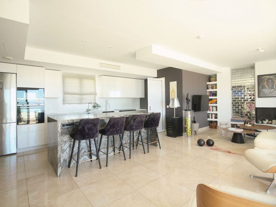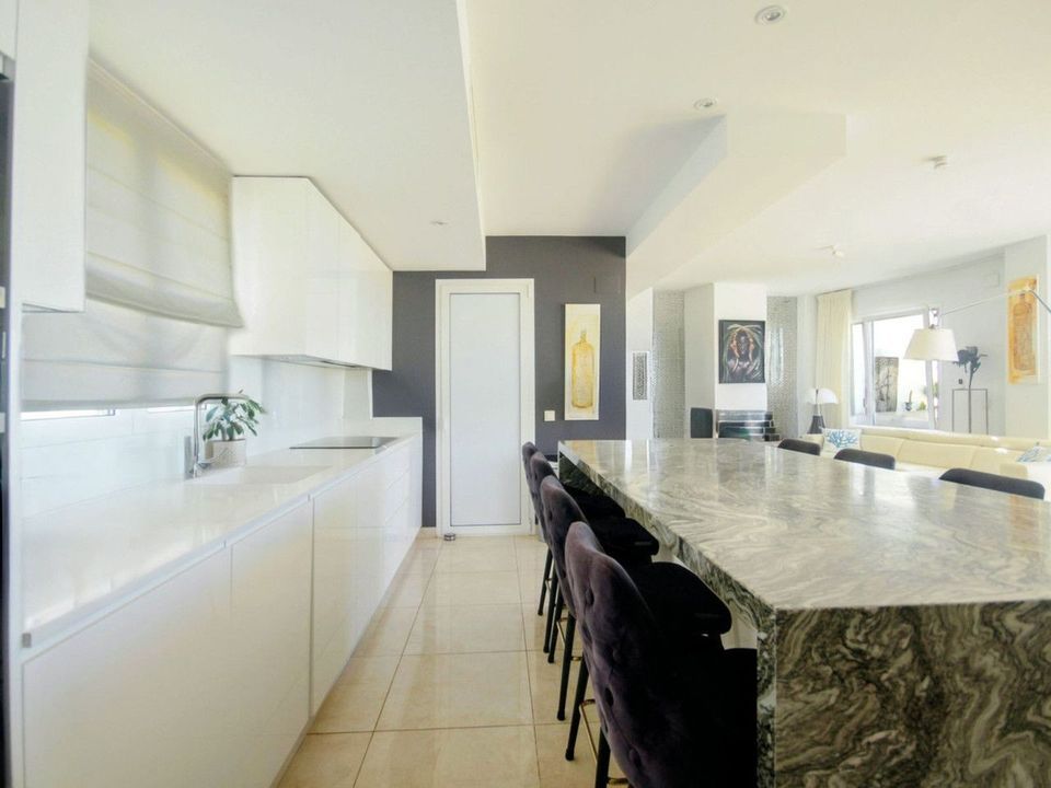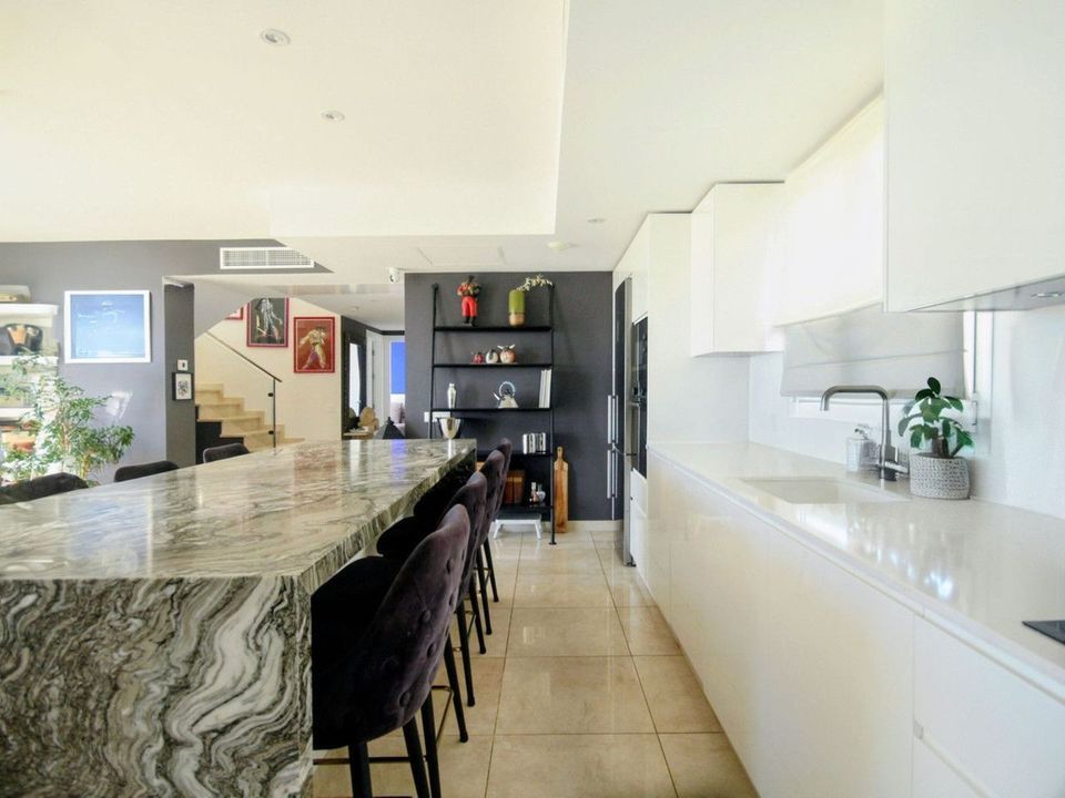 Een semi-privé lift brengt ons naar een privé-etage/entree. Bij binnenkomst vinden we een lichte, ruime, open woonruimte met hoge plafonds. Overal ligt prachtig opgewaardeerd marmeren vloer en er is een goed uitgeruste keuken met een prachtige kookeiland met kwartsiet werkblad. Alle plafondlampen zijn energiezuinig en dimbaar.
