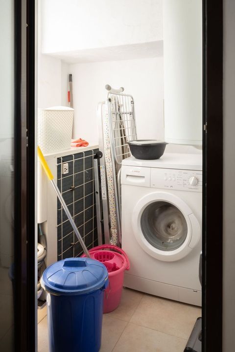 Moderne keuken: Granieten aanrechtbladen. De keuken heeft een praktische wasruimte.