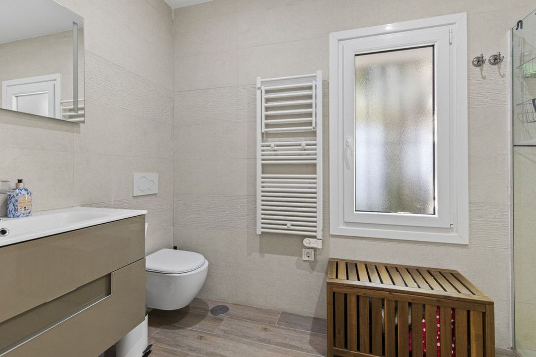 Two of the four bedrooms enjoy ensuite bathrooms, while all benefit from ample storage and natural light. The home is equipped with central heating and air conditioning, ensuring year-round comfort. Outside, the property continues to impress with a covered terrace with beamed ceilings, tiled sun terrace, and a large, private garden facing east—perfect for morning sun. The fenced swimming pool provides peace of mind for families, and the outdoor areas invite relaxed Mediterranean living.