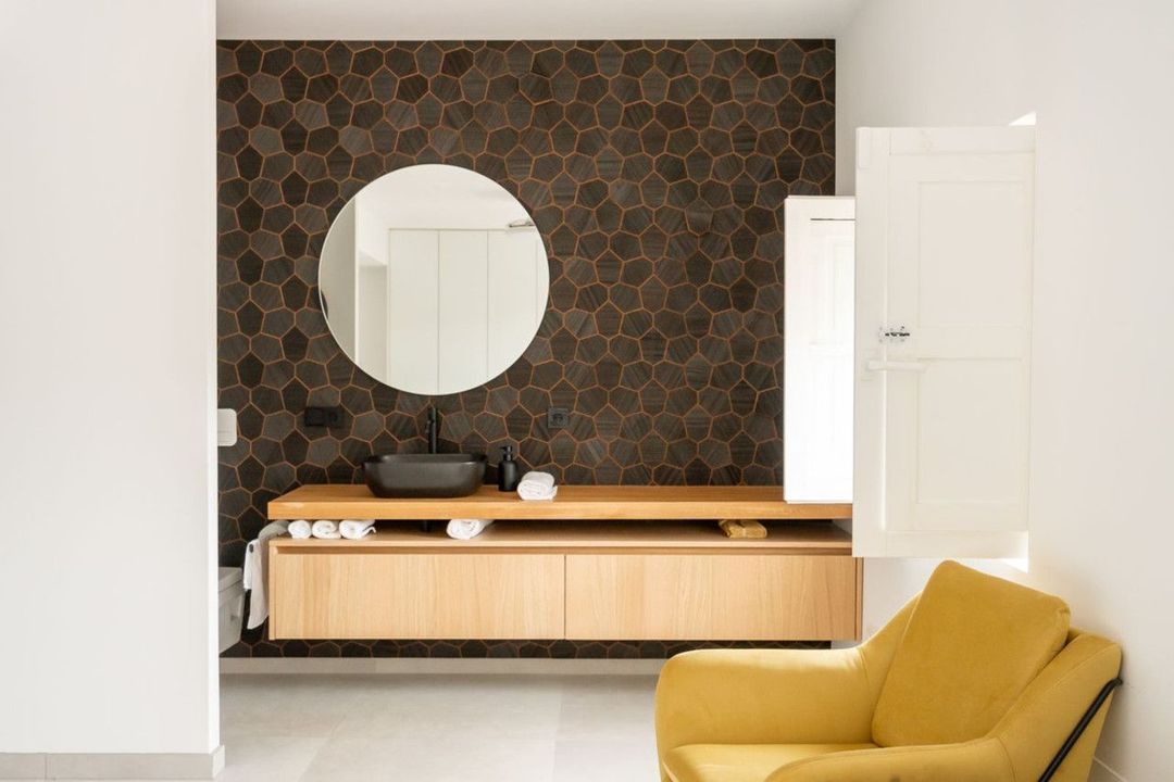 Upstairs, two serene bedrooms provide a peaceful retreat, with the primary suite overlooking lush communal gardens. High-end finishes include Marazzi Italian tiles, Treemme fixtures, Villeroy & Boch appliances, and porcelain flooring throughout. Underfloor heating ensures comfort year-round.