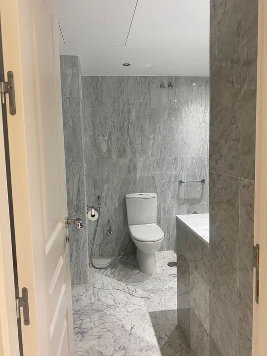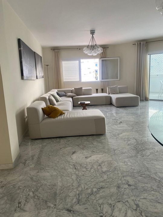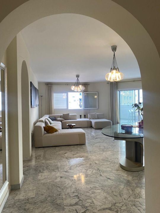 The apartment features a spacious and bright living area, tastefully decorated in soft neutral tones that enhance the sense of space and refinement.