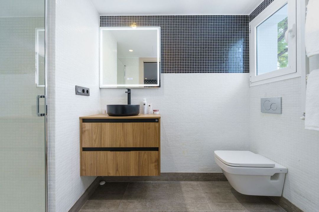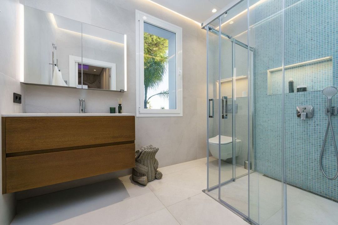 De bovenverdieping biedt een extra leefruimte, een gastenkamer met een inloopkast en een eigen badkamer, en een luxe master suite compleet met een grote inloopkast en een elegante en-suite badkamer. Vanaf deze verdieping heeft u toegang tot het indrukwekkende zonneterras, dat een prachtig uitzicht op zee, ruime chill-out gebieden, en zonnedeks perfect voor ontspannen of onderhouden biedt.