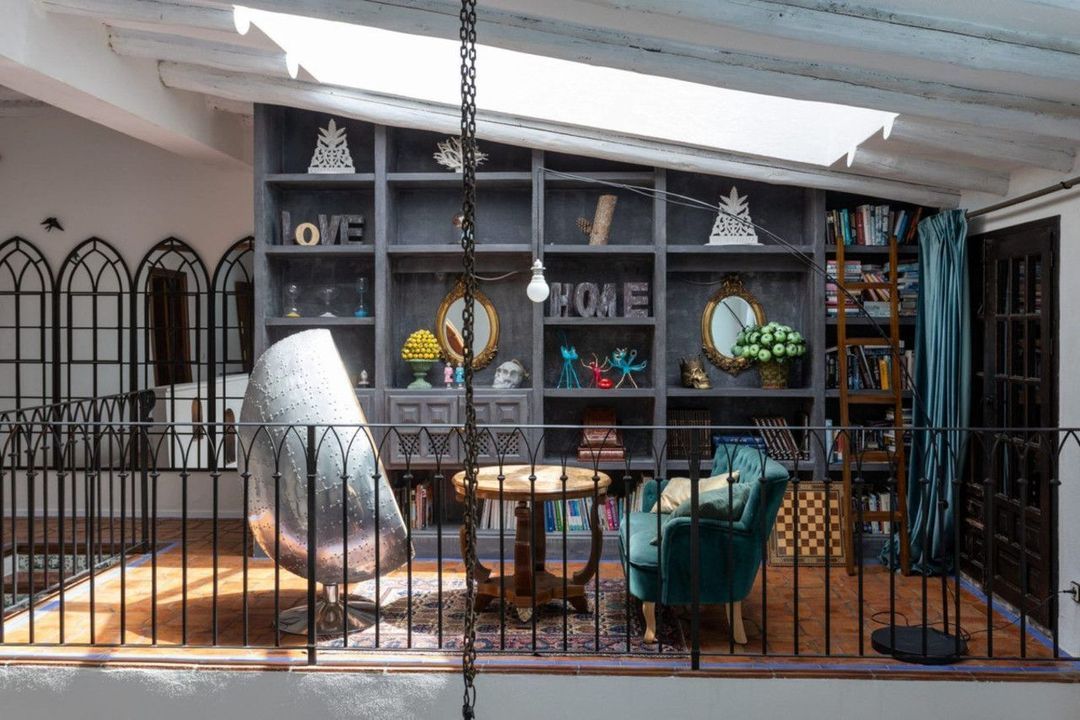The heart of the villa is the living room, characterized by its impressive ceiling height and welcoming fireplace. Natural light floods the space through the expansive windows, offering direct access to the garden. A library located above the living room provides a serene space for reading and relaxation. The dining room is perfect for hosting large gatherings, with direct access to the patio. The well-equipped kitchen boasts ample cooking space, accompanied by a dining area ideal for breakfast.