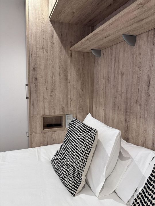 Cozy property with an elegant contemporary style, consisting of a living room with kitchen, bedroom area, and bathroom.