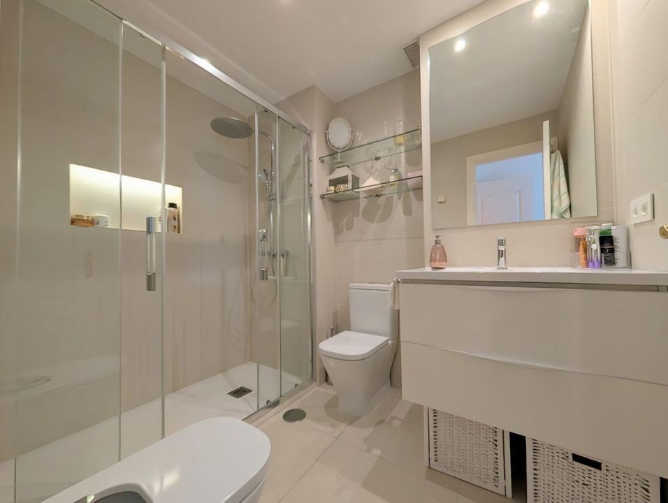 On the entrance level: hall, a great size living-dining room with access to sunny south-west facing terrace overlooking community gardens & swimming pools; ample fully fitted kitchen & utility room, two guest bedrooms sharing family bathroom (with walk-in shower) and master bedroom with en-suite bathroom (walk-in shower). All the bedrooms are good size and with plenty of natural light. The marble staircase takes to the upper level where there is a second living room, guest bedroom and a bathroom (with walk-in shower and Sauna), lovely uncovered terrace with sunbathing and sitting areas - ideal for entertaining guests.