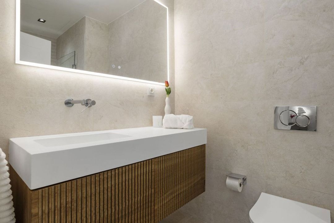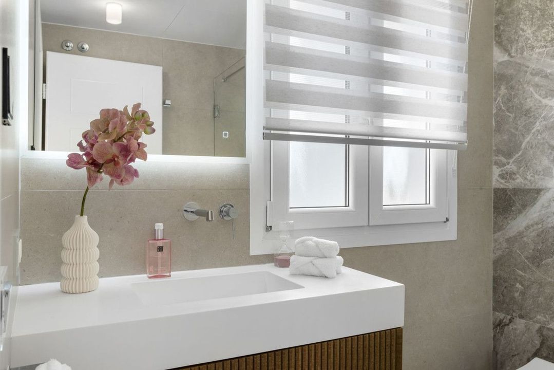 The penthouse includes five beautifully designed bedrooms, including a spectacular master suite on the upper level. With slanted ceilings, a generous walk-in closet, a spa-inspired bathroom, and a private terrace overlooking the sea and La Concha mountain, this is an oasis of complete relaxation. Two additional bedrooms feature en-suite bathrooms, while two share a modern family bathroom. A flexible fifth room serves perfectly as a guest bedroom or office. A separate laundry room with terrace access shows that even the practical details have been given the same attention.