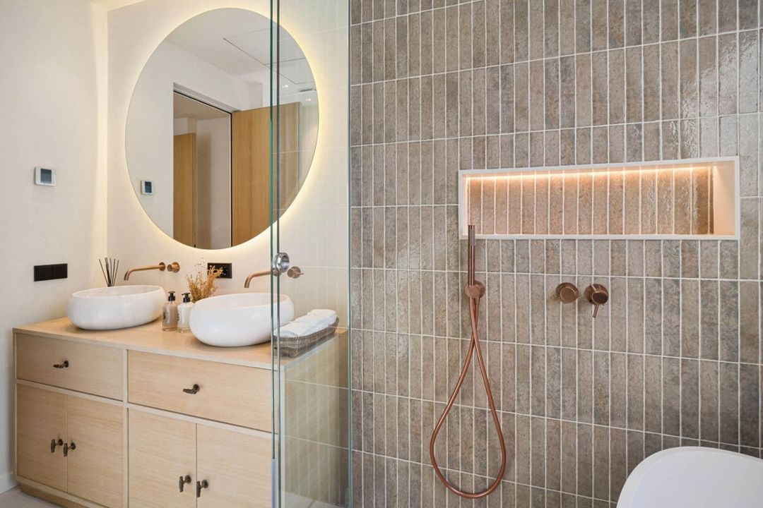 Step inside to discover a calming palette of natural tones, soaring vaulted ceilings, and an open-plan living space that seamlessly flows into a modern kitchen and dining area. Each detail has been carefully curated, from the sleek finishes and custom furnishings to the high-spec appliances and ambient lighting. Floor-to-ceiling glass doors invite natural light throughout and open onto a generous terrace complete with a sunken lounge, outdoor kitchen, and a striking pool that appears to float above the landscape.