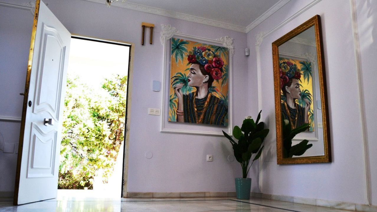 The villa has a spacious living room covered by a glass ceiling, with roman columns, carpets and drapes, and has multiple seating areas. From here there is a direct access to the back terrace with patio and BBQ area, with an outdoor equipped kitchen, interior with large formal dining room and a fully fitted kitchen.