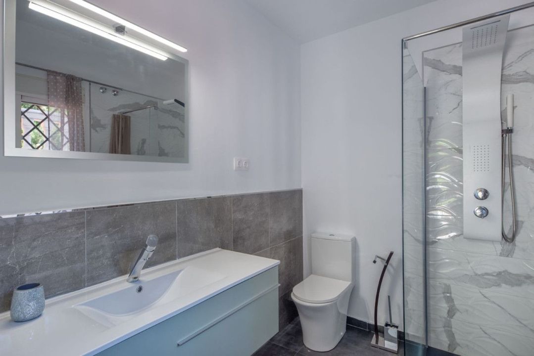 Built on 3 floors, the villa offer 7 double bedrooms in the main building and 3 bedrooms in the separated apartments, 8 bathrooms, laundry room with washing/drying machine, gym area with sauna and jacuzzi. A swimming pool with sunbeds and side tables,