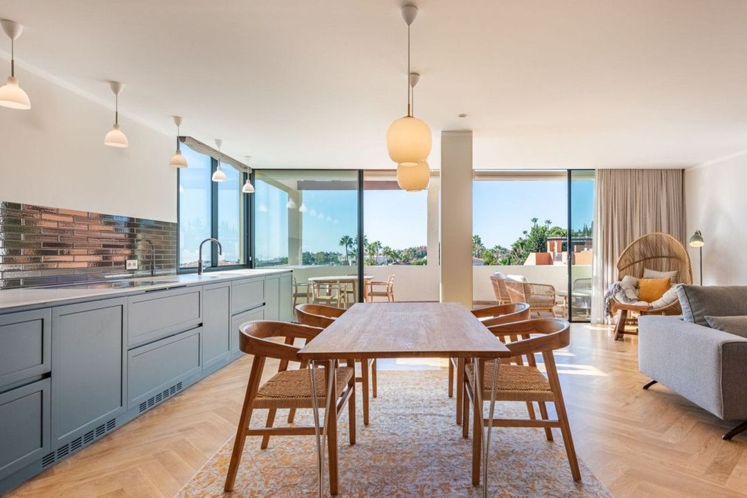This modern and bright apartment has been completely renovated to the highest standards, offering a stylish and open layout. The spacious living and dining area seamlessly connects to the contemporary Gaggenau kitchen, creating an ideal space for both everyday living and entertaining. Large windows fill the home with natural light and open onto a generous terrace boasting breathtaking panoramic views over Marbella, the Mediterranean Sea, and the surrounding mountains.