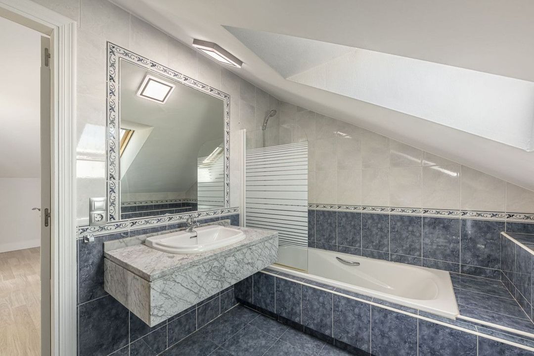 On the top floor, the bedroom has an en-suite bathroom and access to a sunny private terrace with unobstructed views.