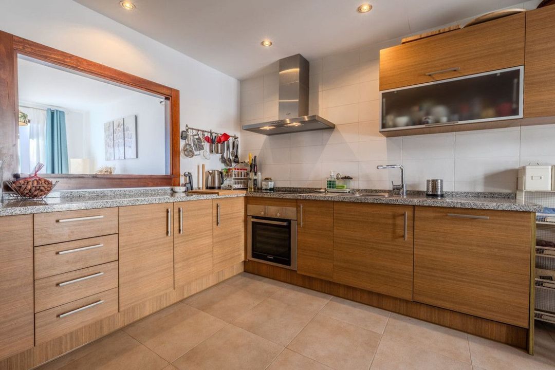 Op de begane grond bevindt zich een lichte en ruime woon-eetkamer met grote ramen die uitkomt op een ander terras, eveneens voorzien van een houten pergola en zonnescherm, met een prachtig panoramisch uitzicht op zee. Deze verdieping omvat ook een gastentoilet en een volledig ingerichte, aparte keuken met een aparte wasruimte.