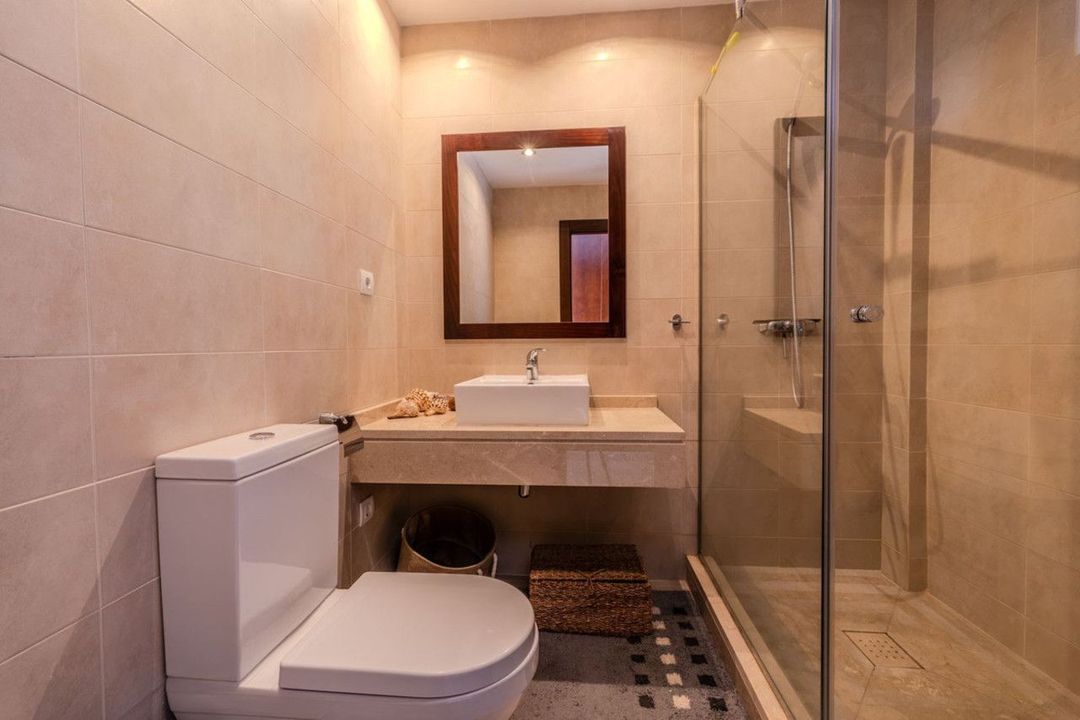 De bovenverdieping beschikt over twee ruime slaapkamers, elk met een en-suite badkamer met veel natuurlijk licht, wat zorgt voor uitstekende ventilatie en lichtinval. Beide slaapkamers geven toegang tot een privéterras met houten pergola en zonnescherm, een ideale plek om te genieten van de zonsopgang of ontspannende avonden onder de sterren met uitzicht op zee.