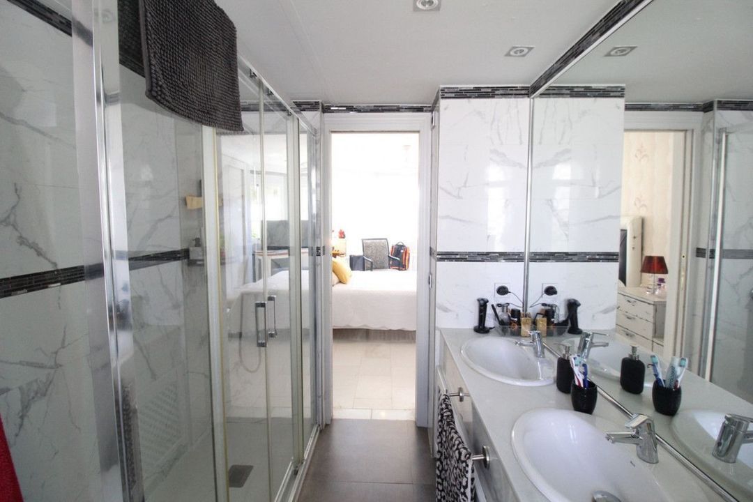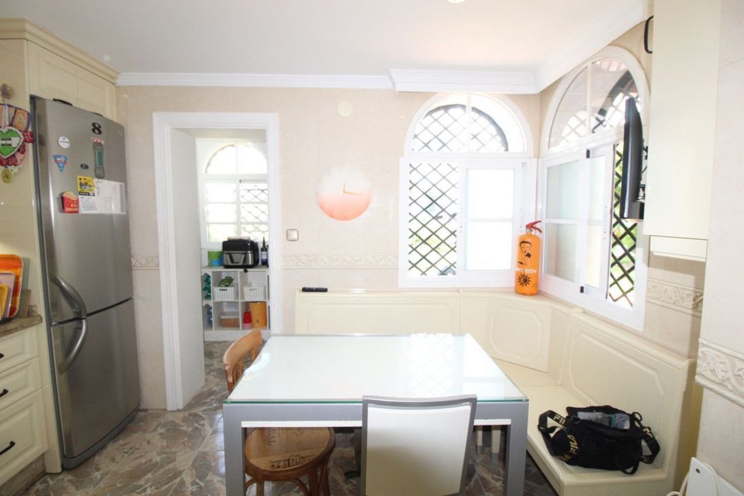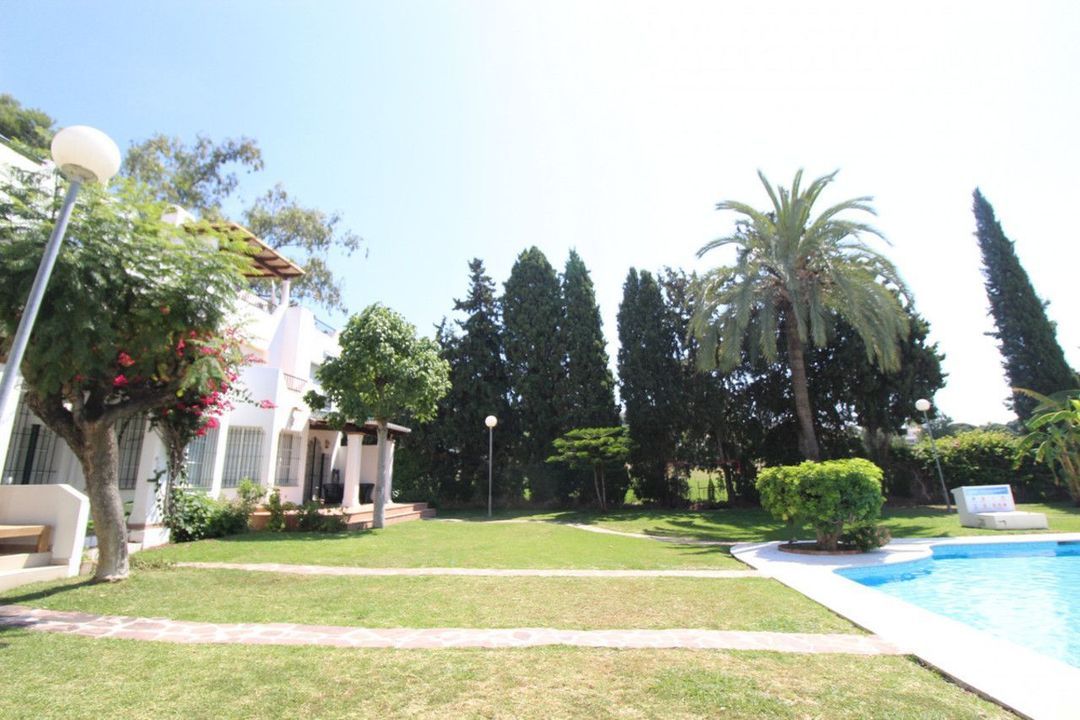 Enjoy the communal garden from the lounge porch! On the first floor are the 3 bedrooms and 2 bathrooms, one of them en suite with shower and large dressing area. New wardrobes in all bedrooms . It is a closed and very well maintained community. The house has several Porches, and huge Solárium with a wooden roof recently put so this new one. Ideal for chill out area and outdoor dinners with barbecue and closed part as well as laundry room. The fantastic panoramic views of the whole wooded area and the mountains of La Quinta. The urbanization is close to everything: Supermarkets, Colleges, Shops, Restaurants etc.. is ideal for Holidays or for families. And perfect to live all year. It has general air conditioning throughout the house and blinds. San Pedro de Alcántara is a 4-minute drive from Puerto Banus. It is for all an ideal house for families and also for investment and enjoy Marnbella with everything next to it;