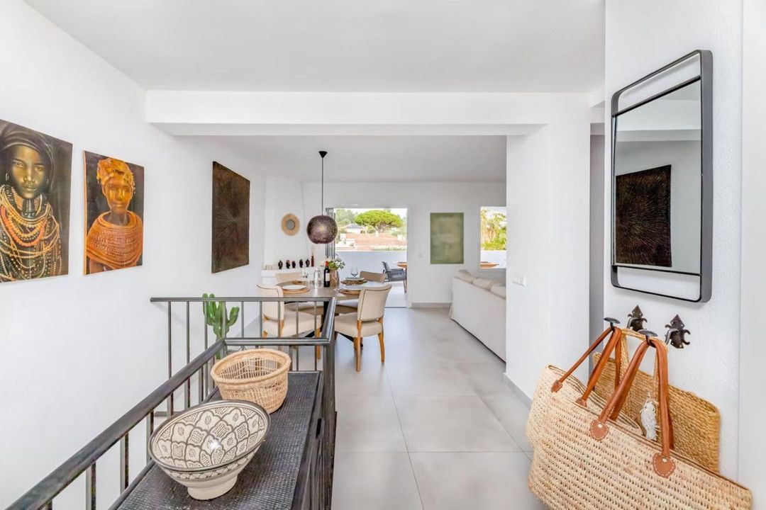 East Marbella, Elviria centre. For sale fantastic renovated and charming townhouse in Pueblo Sueco. This townhouse was refurbished to high quality standards in 2018 and beautifully decorated throughout. The property has a modern feel of top quality and is built over 2 floors. When entering the plot you will find an inviting west patio partially covered. It is furnished with chillout daybeds and there is lots of space for al fresco dining. There are mature types of spectacular cactus and easy maintaining planters. Entering the house you will find a handy guest toilet on the right and the fully equipped kitchen with all the necessary appliances. Also in the kitchen a cosy window to the front patio. The living room has large folding doors to the terrace, good space for two 3 seater-sofas and a nice round dining table next to the fire place. From the living room you access a lovely and spacious covered morning terrace with a 6 seater table, perfect to enjoy your breakfast! The stairs take you to the lower floor where we find a good sized bedroom with another auxiliary bedroom which could be used as dressing room. Another bedroom with a lot of extra space with a desk and dressing area. There are two bathrooms with generous showers, (one ensuite) and a washing/ storage room. These two bedrooms lead you to the patio on the lower floor from which you can access directly to the private pool club. At the patio you will find a beautiful deck where you can relax on the sunbeds and refresh using the solar shower. You can optionally be a member of the club for a yearly fee. There is Daikin hot and cold air conditioning system, underfloor heating in the bathrooms and high speed fibre optic. The neighbours are a combination of local and international nationalities. There is only a 10 minute walk to the best beach in Marbella, a 10 minute drive to Marbella city and less than 45 minutes to Malaga airport. There are as well several 18 hole golf courses like Santa Maria Golf, Santa Clara, Rio Real and Marbella Golf. Marbella has become a brand in Europe and all over the world with 320 days of full sun a year and total of 2900 hours of sun. Elviria represents the very essence of quality of life on the Costa del Sol. It is located in a unique natural setting and has a fantastic range of facilities nearby, including three 4-and-5 star hotels: Don Carlos, Marriott and Estrella de Mar, renowned golf courses such as Santa María and Green Hills, a Michelin-starred restaurant, Nikki Beach Club and one of the best beaches on the coast, all flanked by outstanding bars and restaurants, supermarkets and a local street market every Friday and an organic market every other Saturday. In addition, there is a Town Hall, doctor's office, post office, a wide range of schools, including private schools...all within walking distance. This is a unique opportunity and the ideal location for both a permanent residence or dream holiday home.