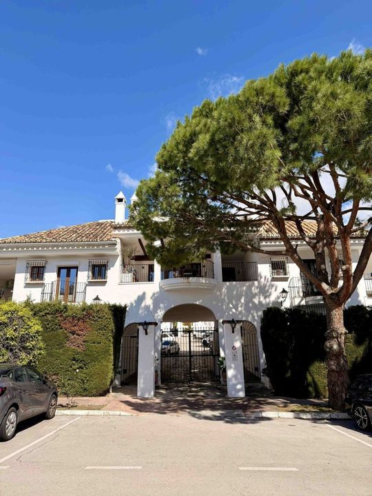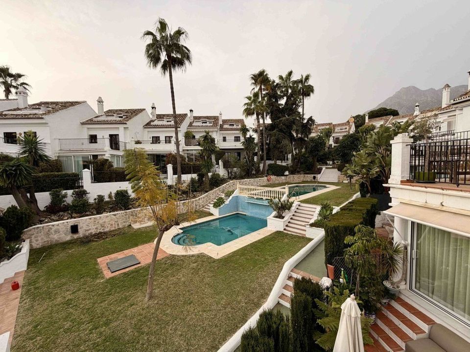 Exclusive townhouse in a gated Andalucian style community with two pools, lush mature gardens and excellent location in Nagueles, above the Golden Mile of Marbella.
