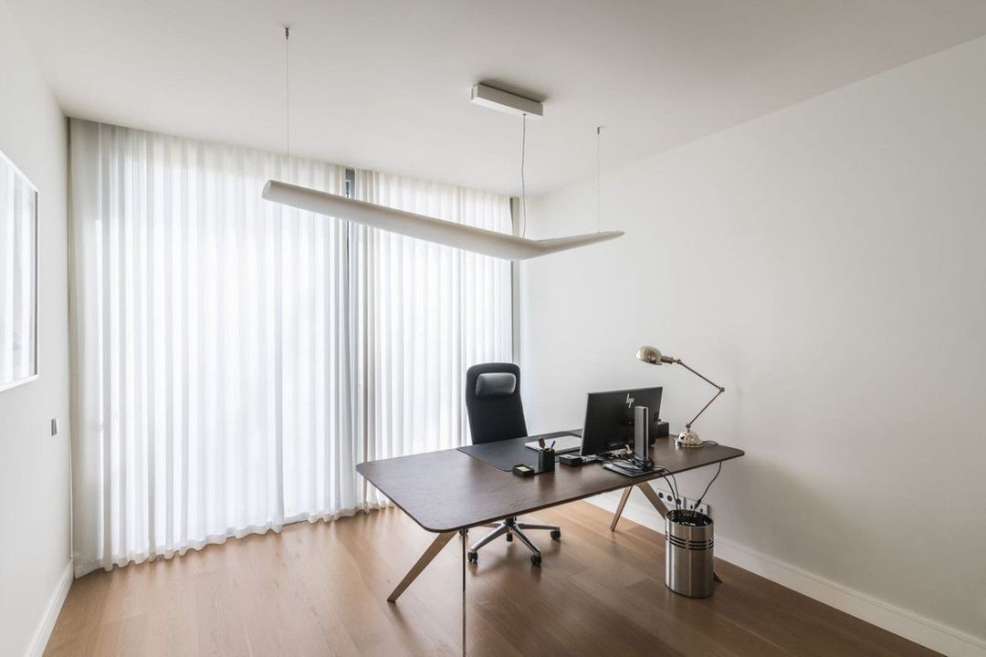 On the ground floor, there is a spacious, bright living room which connects to the dining room and a modern open kitchen, fully equipped with top-of-the-range appliances. Next to the entrance, there is a study, a walk-in wardrobe and a guest toilet.