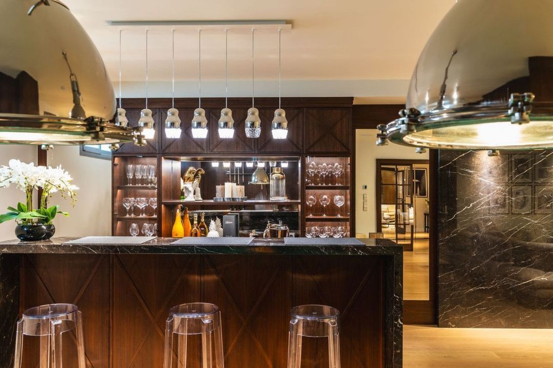 The lower level is an entertainment area with an elegant bar, a TV area, a pool table and a fully equipped gym. There is also a bathroom, a laundry room and a garage.