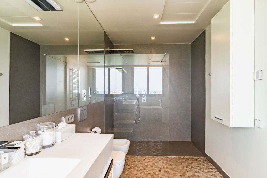 Entering through the impressive entrance hall, you are immediately greeted by views of the private pool, the well-kept garden and the sparkling Mediterranean Sea in the distance. Spacious floor-to-ceiling windows fill the house with abundant natural light, creating an atmosphere of space, luxury and harmony with the surroundings.