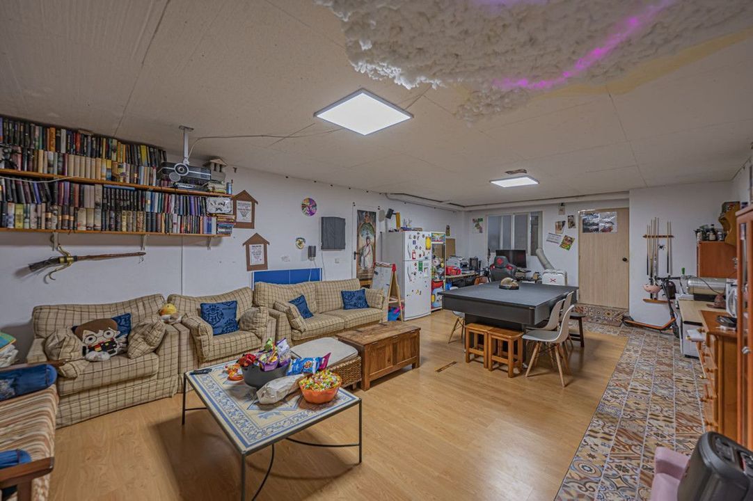 This spacious semi-detached house, distributed over several floors, offers a total of four bedrooms, three bathrooms plus a guest toilet, a living room with a fireplace and a separate kitchen, and a large basement with a cinema room, games room, etc.