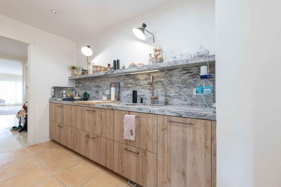 The kitchen has been newly installed with modern cabinetry and includes a water filtration system. Large windows and the ground-floor position allow natural light to fill the living spaces, creating a comfortable and open atmosphere.