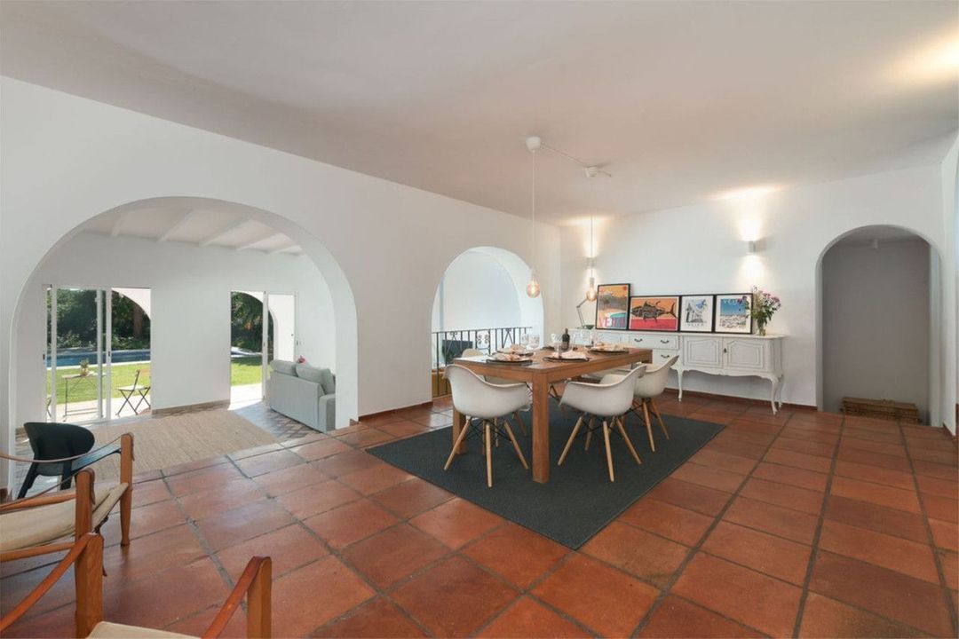 Deze prachtige villa in haciënda-stijl is gelegen in een rustige woonwijk van Artola Alta, vlakbij Cabopino. Op korte loopafstand vindt u het natuurreservaat, de duinen en het strand van Artola, en het strand en de haven van Cabopino met zijn restaurants en supermarkten. De villa bestaat uit drie slaapkamers en twee badkamers, twee woonkamers en een keuken met bijkeuken. De indeling is functioneel en gelijkvloers, waardoor privacy gegarandeerd is doordat de hoofdslaapkamer en badkamer gescheiden zijn van de gastenslaapkamers en badkamer door de woon- en eetkamer. Het huis is omgeven door een muur en biedt veel privacy. De woning is vanaf de straat aan de noordzijde toegankelijk via een poort die leidt naar de patio, vanwaar u toegang heeft tot een dubbele garage en een overdekte entree naar het huis. Vanuit de entree komt u in een volledig ingerichte keuken en een ruime eetkamer. Vanuit de woonkamer, die ook toegang biedt tot een overdekt terras, opent het huis zich naar de tuin en het zwembad. Het zwembad is omgeven door een weelderige, volgroeide tropische tuin met diverse fruitbomen. De woning beschikt ook over een dakterras van 20 m² waar u kunt genieten van het uitzicht op zee en de zonsondergang boven de baai van Marbella en de berg La Concha.