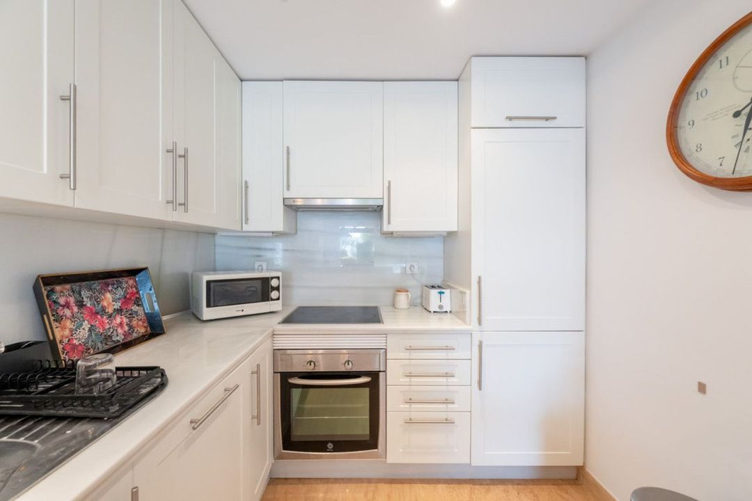 Originally a large one bedroom, this was converted to 2 bedrooms and one bathroom. As you enter the apartment, you are welcomed by the large open hallway that leads straight into the open plan lounge, decorated beautifully with high end furniture and fixtures. A cute white kitchen is to the right of the entrance and opens onto the dining room and lounge. Continue through the lounge and you come to the expansive, beautiful terrace that is facing the pool and south!