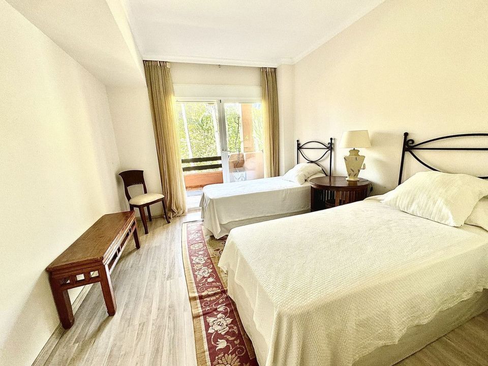 Spacious three-bedroom, three-bathroom flat located in the prestigious Alhambra del Golf residential complex, phase 3, in Guadalmina Baja, close to all amenities and the beach. This is a gated community with beautiful gardens and a communal swimming pool.