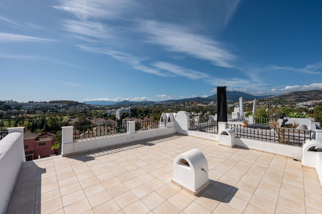 Upstairs, the master suite offers its own generous bathroom and steps out onto a fully private uncovered terrace. The elevated position here noticeably amplifies the already beautiful panoramic views. From here, a staircase leads to the crown of the home: a 30 m² rooftop solarium with far-reaching panoramic views over the Nueva Andalucía golf valley and mountains, a space made for sundowners and long Mediterranean evenings.