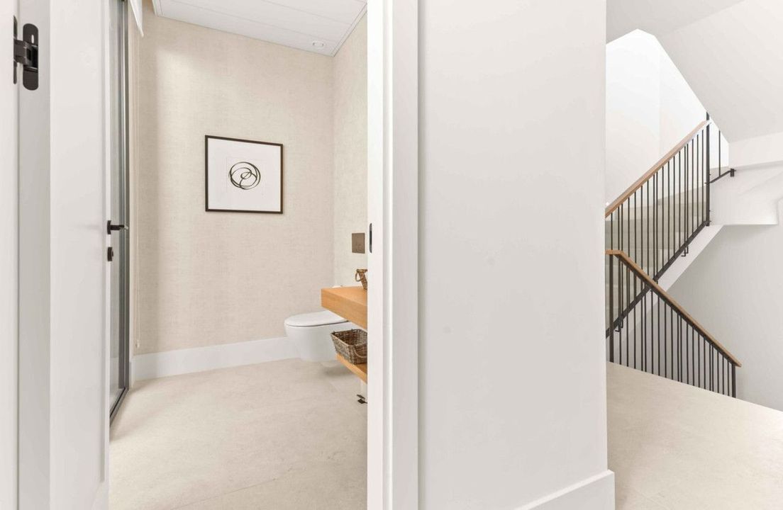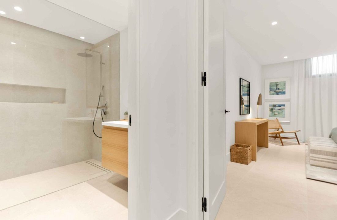 The bedroom distribution includes five bedrooms with integrated storage and a balanced layout between private and shared zones. The primary suite benefits from direct access to a terrace and includes an en-suite bathroom. Additional bedrooms are arranged to maintain privacy while remaining connected to the main circulation areas. Bathrooms are finished with contemporary materials, and the inclusion of a guest toilet supports daily functionality.