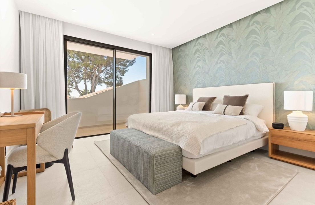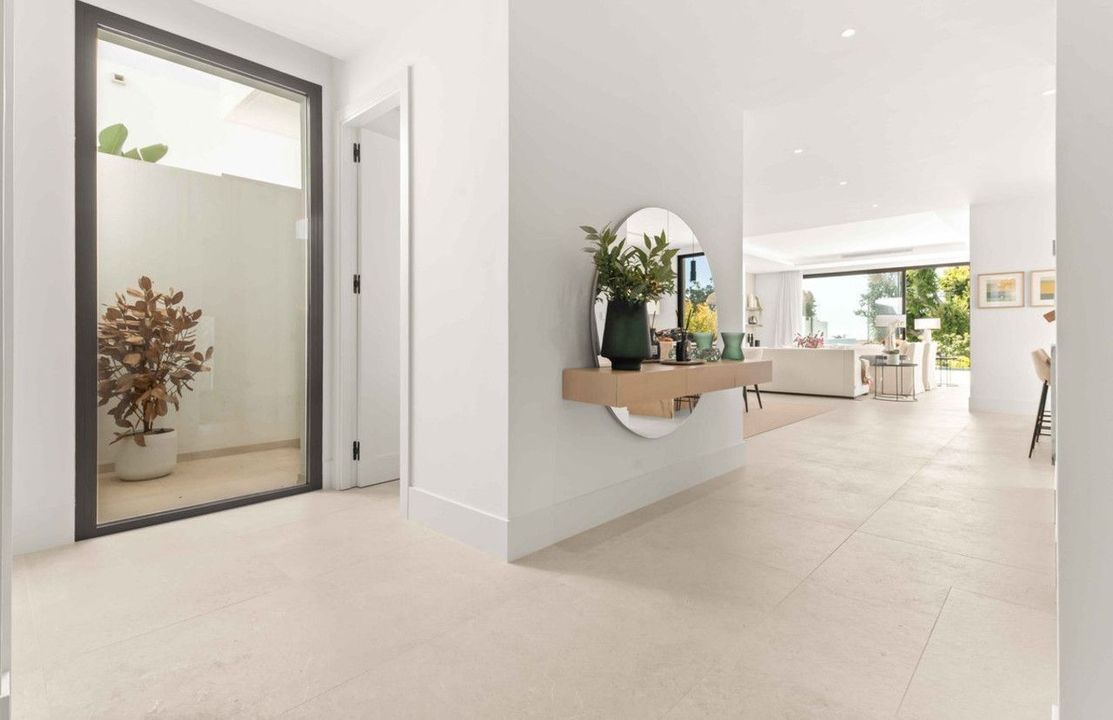 The property presents a contemporary architectural profile within a residential area of San Pedro Alcántara, positioned close to golf, shops and schools. The exterior composition combines clean white volumes with natural stone elements, creating a structured façade that integrates with its surroundings. The property presents a contemporary architectural profile within a residential area of San Pedro Alcántara, positioned close to golf, shops and schools.