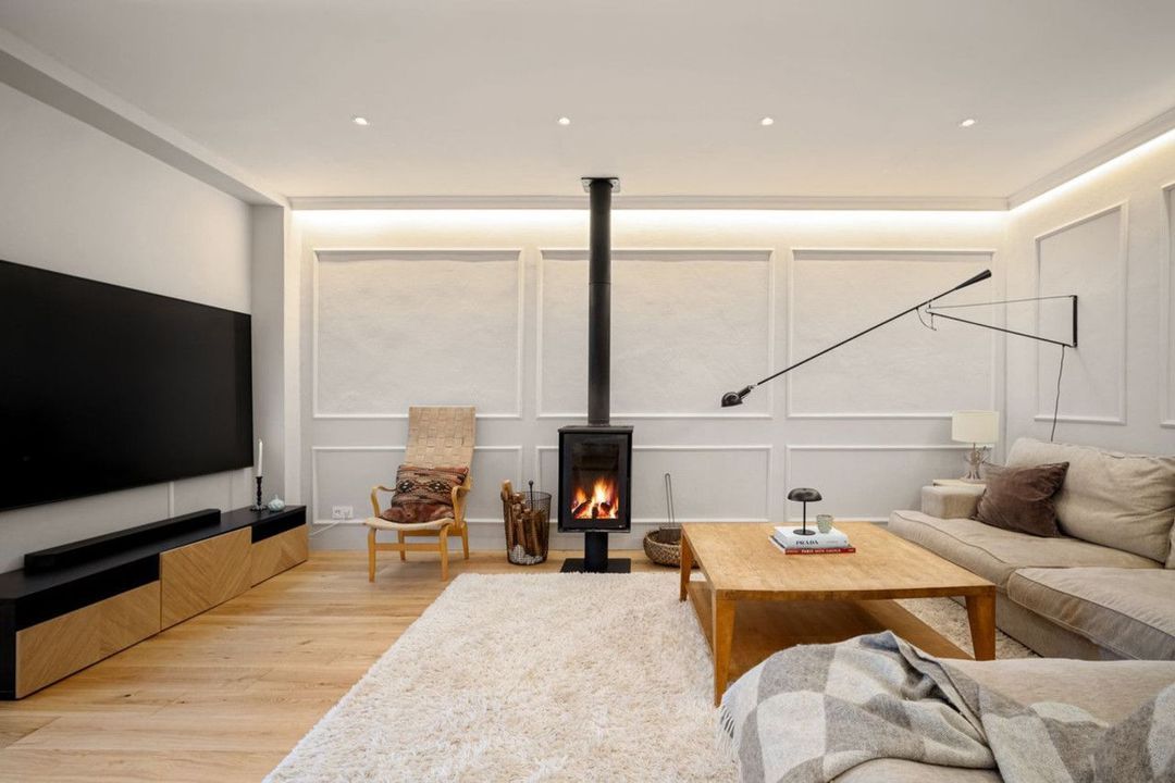 Op het lagere niveau biedt een tweede woonkamer met open haard en tv-hoek een knusse plek om te ontspannen, samen met een wasruimte, een royale master bedroom met eigen badkamer en kleedkamer, een kinderkamer en een extra badkamer.