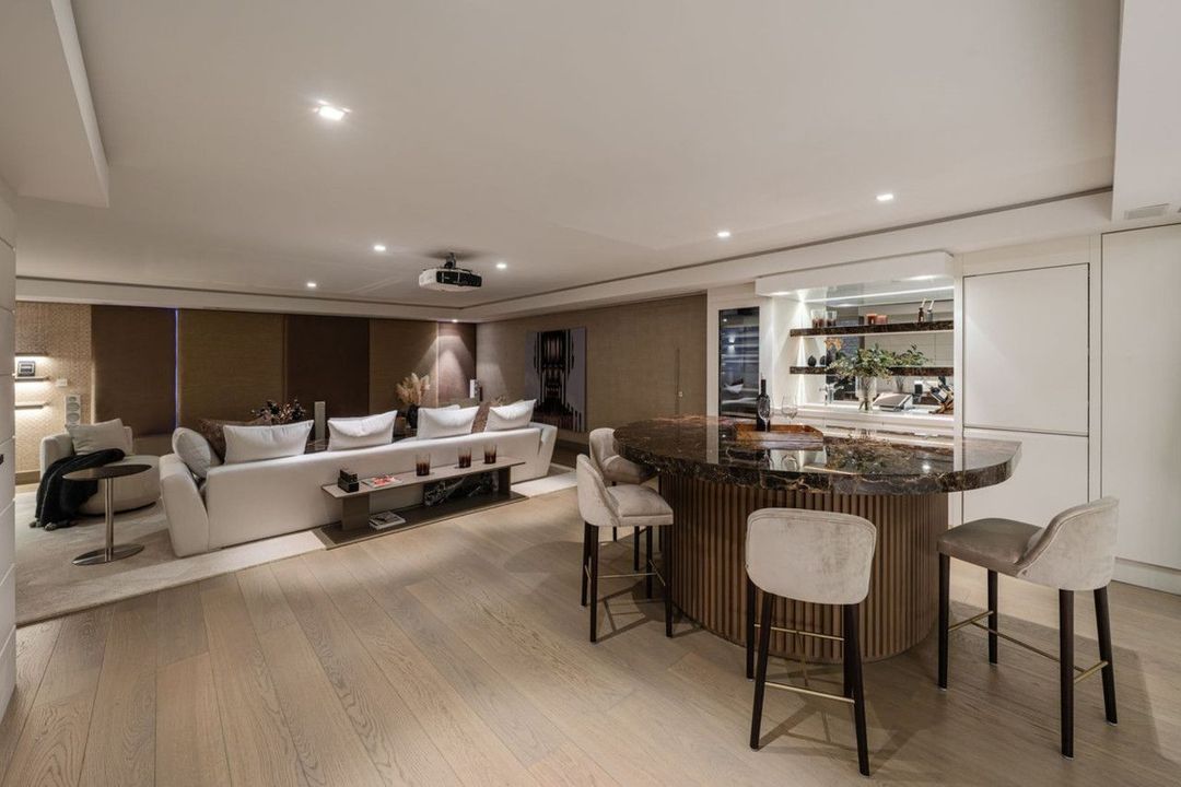 This is a house for people who value flow. The lower level handles leisure properly — entertainment room with bar, cinema area with projector, gym and sauna — so the living floors remain clean and composed. Upstairs, the kitchen, dining and living space opens directly onto the terrace, where the pool meets the line of the sea rather than competing with it. Light, proportion and modern design do the heavy lifting; nothing here asks for attention, yet everything earns it.