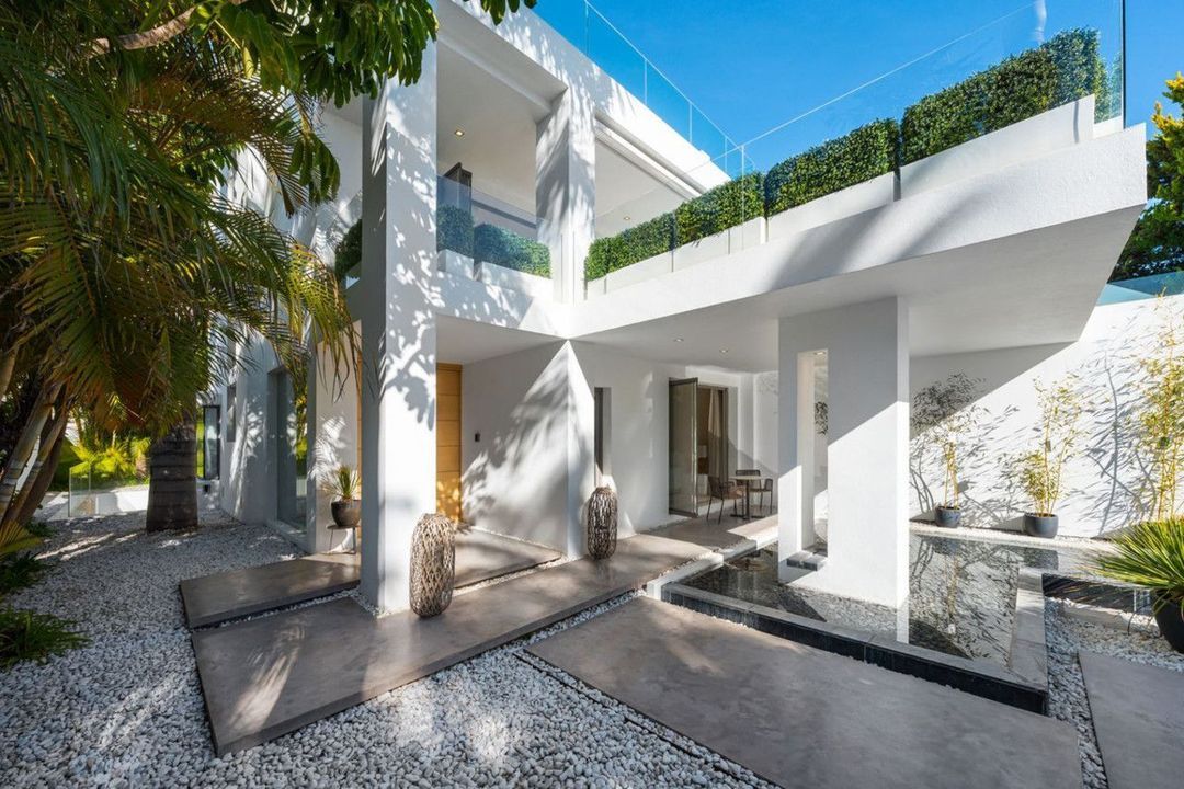 A semi-detached villa in the urbanisation, four bedrooms, four bathrooms, arranged with intent rather than habit: basement level below, an entrance floor with three en-suite bedrooms and a calm water feature setting the tone, a first floor dedicated entirely to open-plan living with terrace and private pool, and a second floor reserved for a full-width master suite with walk-in wardrobe, private bathroom and sea-facing terrace. A private lift connects every level, from garage to rooftop calm, without interruption.