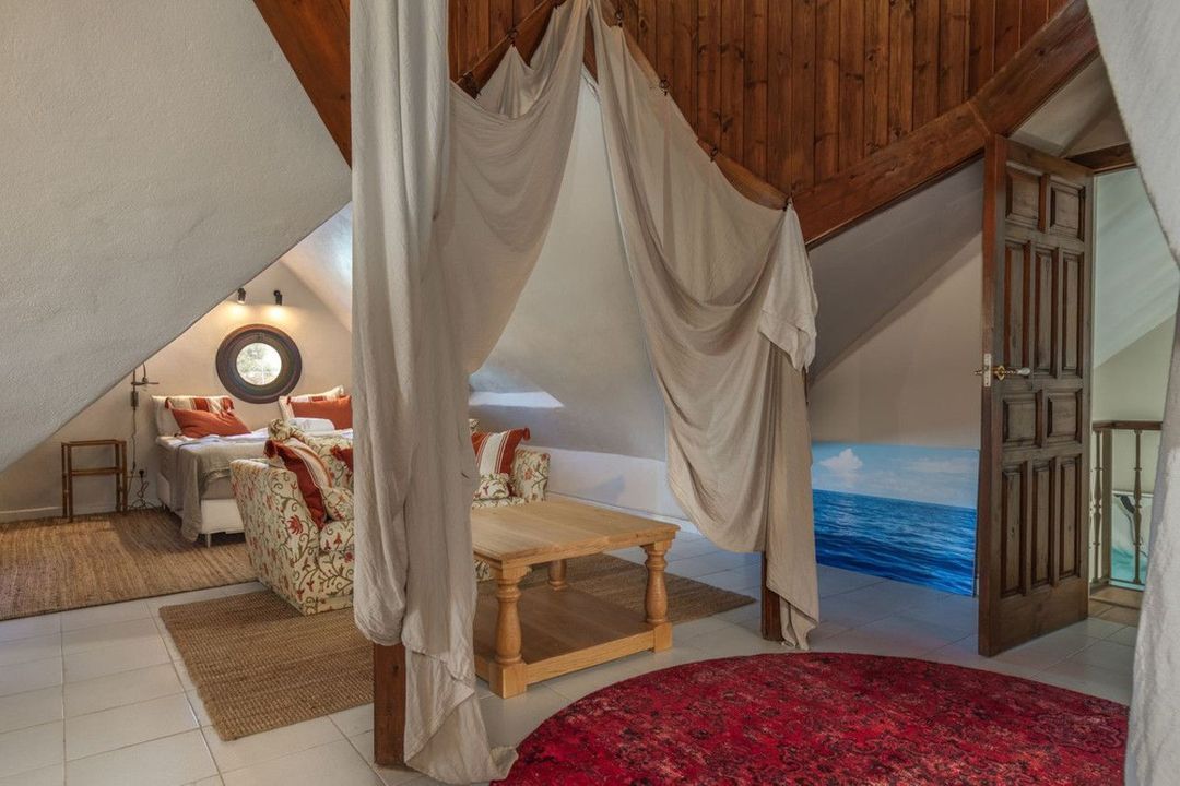The second floor, connected by an open-plan staircase, seamlessly blends with the level below, where striking double-height ceilings enhance the sense of space and invite an abundance of natural light. On this level, a fourth en-suite bedroom is complemented by a converted attic of approximately 50 m². The T-shaped layout creates two additional sleeping areas along with a substantial walk-in closet. The angled ceilings introduce charm and a cosy, intimate feel.