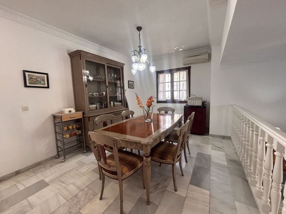 Fantastic opportunity to acquire a semi-detached house with 287 m² built on a generous 460 m² plot, located in the heart of Nueva Andalucía, Marbella, just a short walk from Puerto Banús, approximately 1 kilometre from the beach, and very close to all amenities such as cafés, restaurants, and supermarkets. The property, west-facing and in good condition, offers a comfortable and functional layout. On the main floor, there is a spacious split-level living and dining area, a kitchen with a breakfast nook, a full bathroom, and a wonderful rear terrace ideal for outdoor enjoyment. The first floor features the master bedroom with en-suite bathroom, two additional bedrooms sharing a bathroom, and a balcony with pleasant views. The rooftop solarium offers an open space with the potential to create a fourth bedroom, office, or chill-out area. The basement includes approximately 100 m² with great potential, perfect to convert into an independent apartment, gym, games room or home cinema, and also includes storage space. The house is equipped with air conditioning, built-in wardrobes, a private swimming pool, a garden with a chill-out area, and a parking space included in the price. There is also an additional outdoor area that can be used as an extension of the garden, extra parking, or even for planting a private vegetable garden. This is a fantastic opportunity with plenty of potential and an excellent location in the sought-after Golf Valley of Nueva Andalucía.