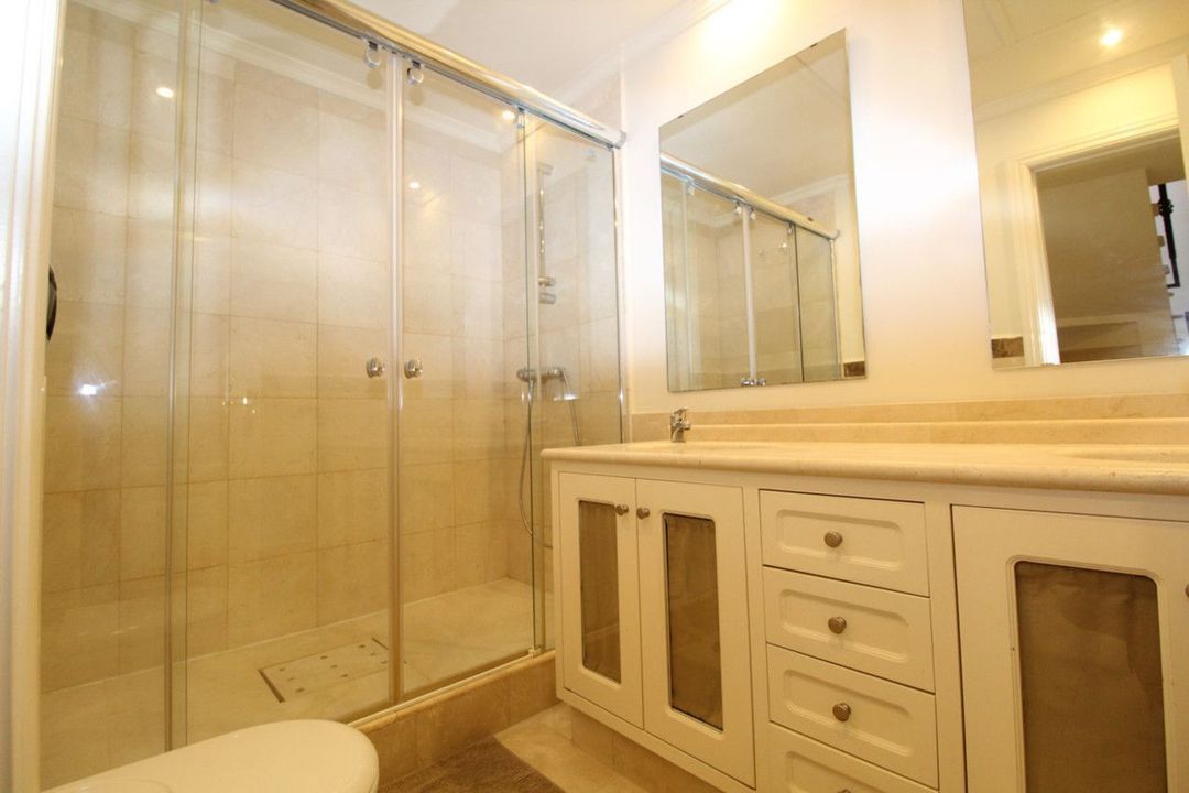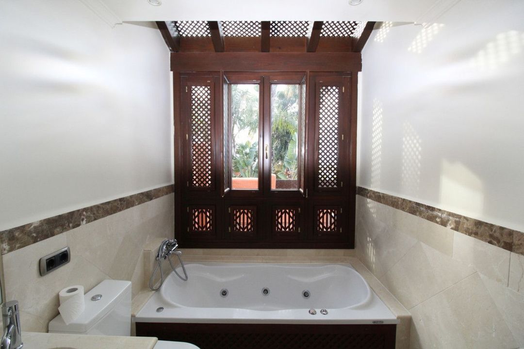 Stunning Andalucian style townhouse located on the famous golden mile in Marbella. A wonderfull designed architecture with Mediterranean taste, surrounded by lush tropical gardens and polos in areas of large ponds make this location a great place to live. The Master bedroom coounts with a dressing room and bathroom with Jacuzzi, separate shower, terrace and balcones. The townhouses also include with a superb roof with solarium and built in barbeche, from were fantastic sea and mountain views can be enjoyed.