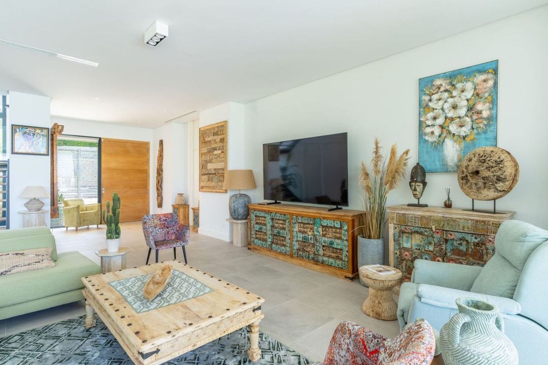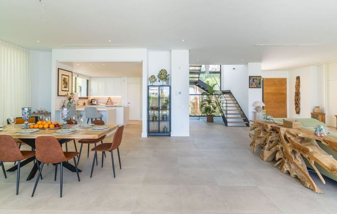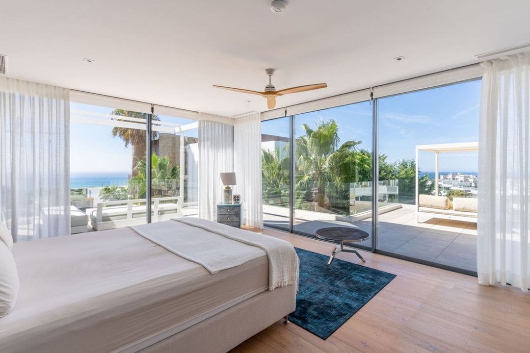 The residence comprises five well-appointed bedrooms, each with its own en-suite bathroom, providing privacy and comfort for all occupants. The bathrooms and living areas benefit from underfloor heating throughout, ensuring year-round comfort, while air conditioning and double glazing further enhance the living environment. The villa features elegant wooden floors and fitted wardrobes, adding to the sense of luxury and practicality.