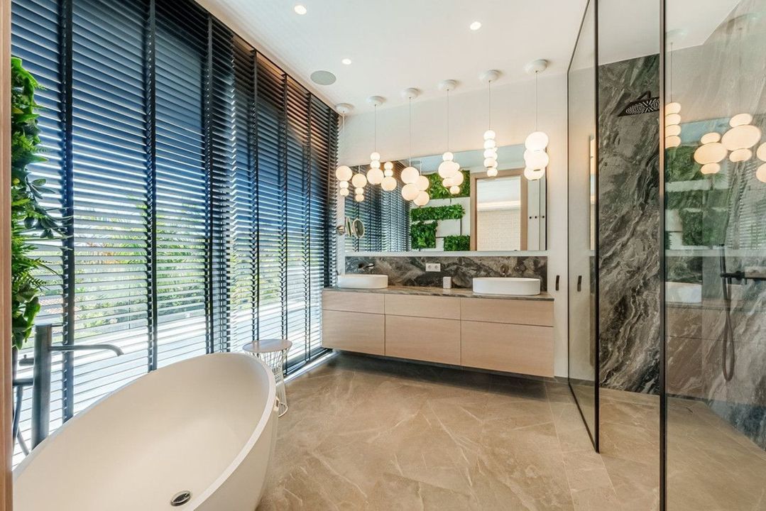 Ascending to the main floor, you will find a designer open-plan kitchen equipped with top-of-the-line Gaggenau appliances. The living room extends onto an outdoor terrace, creating an idyllic indoor and outdoor living experience. Here, you can enjoy a refreshing swim in the pool, prepare meals in the outdoor kitchen, or relax in the chill-out area next to the fireplace.