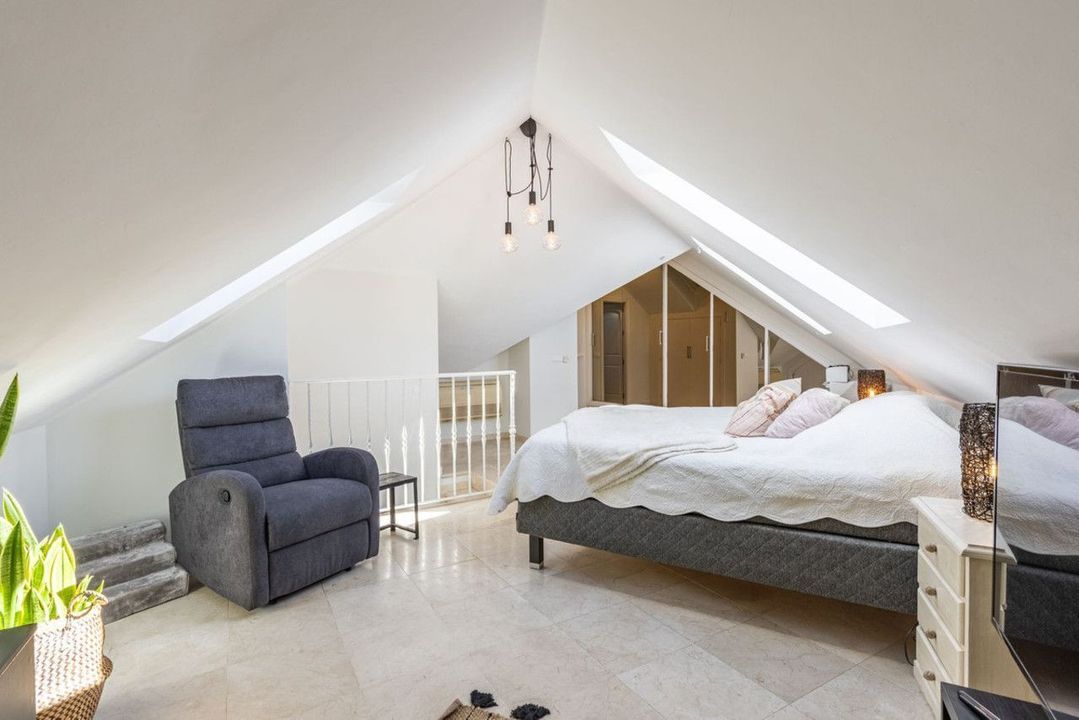 A staircase leads up to the loft level, where the bedroom is privately tucked away. This floor also features a bathroom and a private sauna, adding a touch of luxury and spa-like comfort to the home. The open design of the loft creates a warm atmosphere, making it the ideal place to unwind after a day in the lively town.