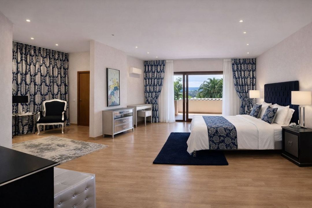 The villa currently comprises 7 bedrooms and 8 bathrooms, including a substantial principal suite with dressing area, large marble bathroom, private terrace, and panoramic views towards La Concha mountain and the sea. Additional guest and staff accommodation give the property flexibility for family, visitors, and service staff.