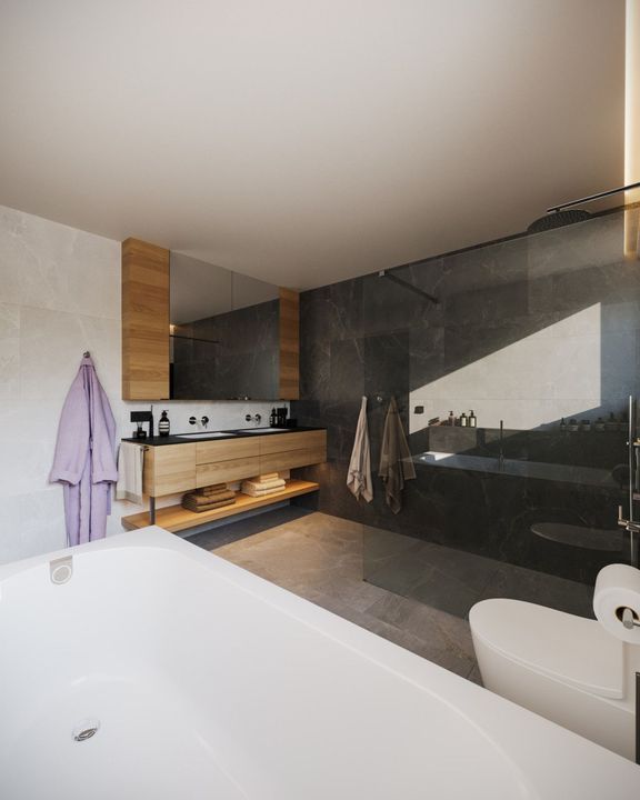 Een marmeren trap leidt naar de eerste verdieping waar de hoofdslaapkamer zich bevindt, compleet met een terras, een inloopkast en een moderne badkamer met zowel een bad als een douche. Daarnaast zijn er drie extra slaapkamers, elk met een en-suite badkamer voor optimaal comfort en privacy voor uw familie en gasten.