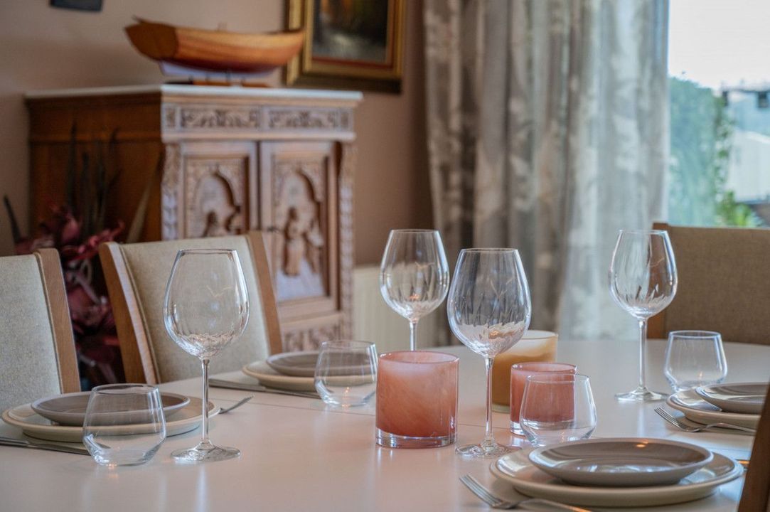 The bright and expansive living and dining area flows seamlessly onto a generous south-facing terrace, ideal for outdoor dining and relaxation. On this side of the apartment, you will also find a stylish guest bedroom and bathroom.