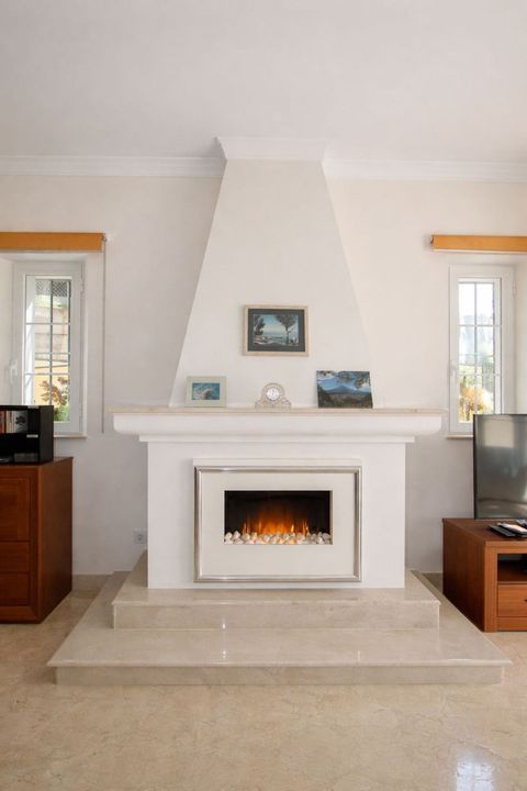 The ground floor offers a bright living and dining area with a feature fire, opening onto a spacious south-facing conservatory and a low-maintenance garden overlooking the communal pool. There is also a generous kitchen which got updated recently with access to a patio terrace and a guest WC. There are electric shutters & electric awnings for the terrace.