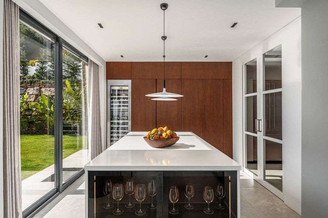 At the heart of the house is a thoughtfully designed living area, where natural light and selected materials create an elegant and relaxing atmosphere. The custom-designed kitchen, equipped with Gaggenau appliances, seamlessly integrates with the dining and living areas, ideal for both daily living and entertaining guests.
