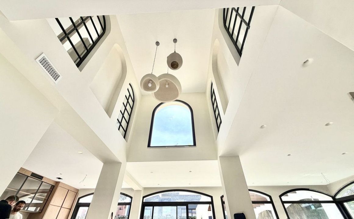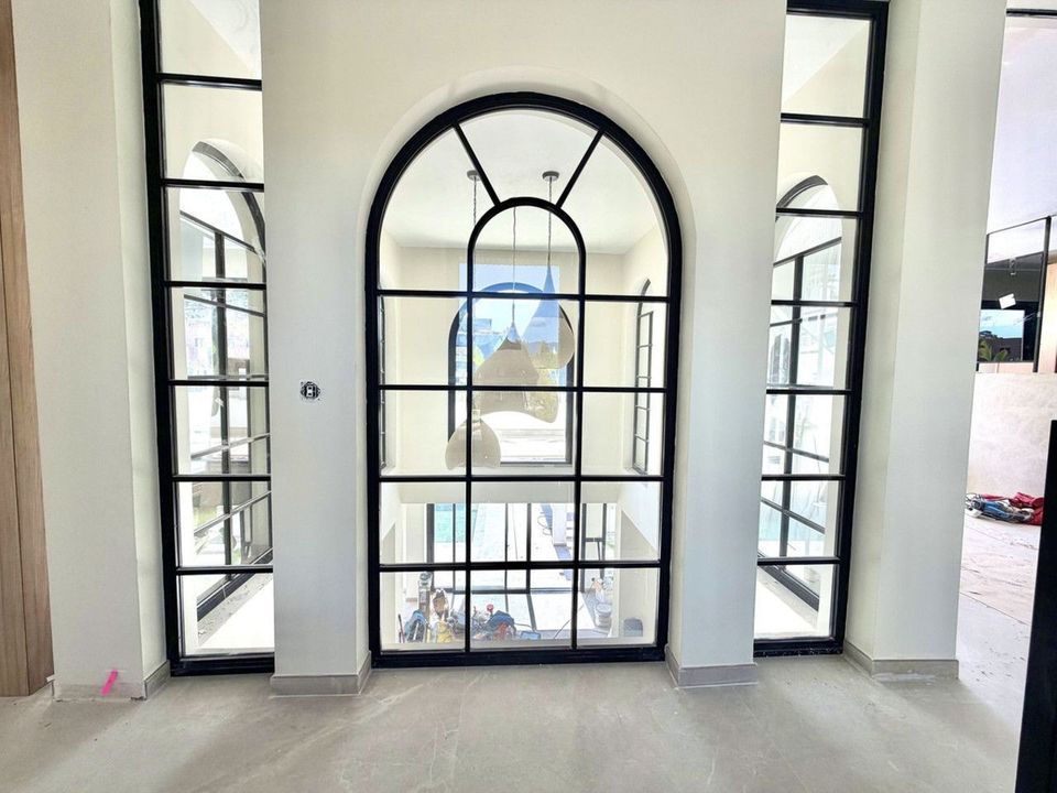 The home is designed to be open, bright and highly social, with a seamless flow between indoor and outdoor living. A large amount of custom work has been carried out throughout the property, including bespoke wood carpentry, natural stone finishes, integrated niches and a modern ethanol fireplace, creating a warm and cohesive design.