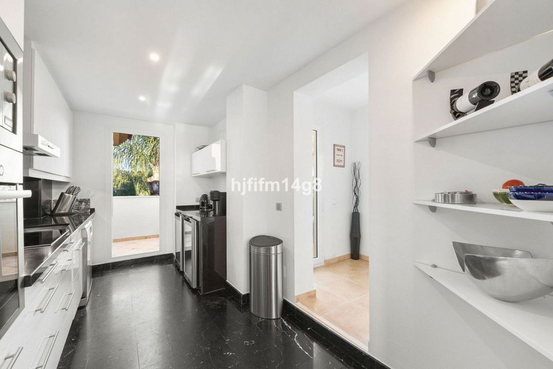The modern kitchen has been recently refurbished and is equipped to a high standard. From the kitchen, you'll find two smaller terraces and a storage room. One terrace houses the laundry area with a washing machine and dryer, while the other serves as a perfect breakfast terrace — enjoy sunrise views or afternoon shade here.