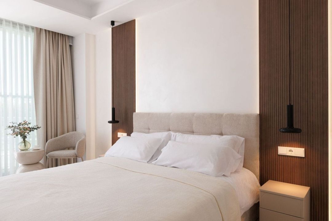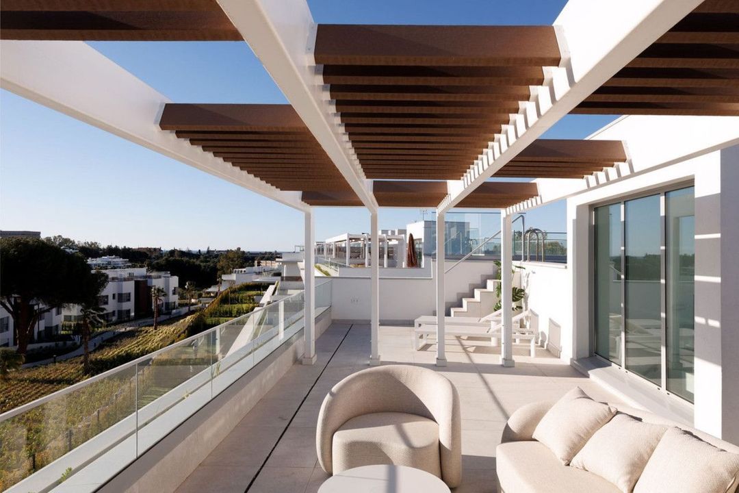 The true highlight of this penthouse is the impressive 128 m² of terraces, designed for both relaxation and entertaining, featuring a private swimming pool, stylish lounge areas, a covered outdoor dining space, and open views over landscaped gardens and modern architecture. The east-facing orientation allows for soft morning light and pleasant temperatures throughout the day, making the outdoor areas enjoyable year-round.