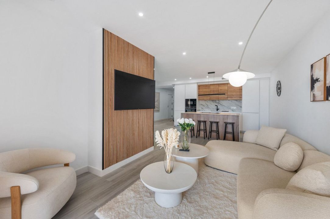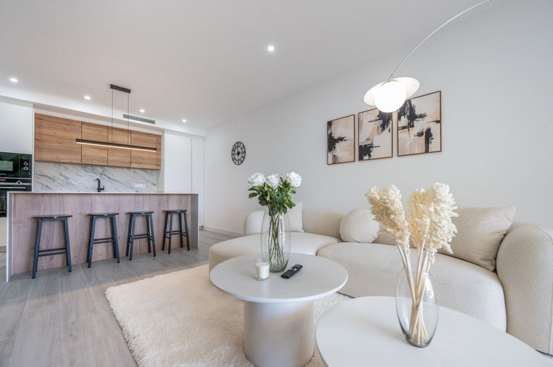 Inside, the apartment features a bright, updated interior with a practical layout. The entrance hall leads into a modernised kitchen, followed by a well-proportioned bedroom. The master suite includes its own bathroom and direct access to the terrace. The living and dining area is comfortable and well laid out, with sliding doors opening onto the terrace.